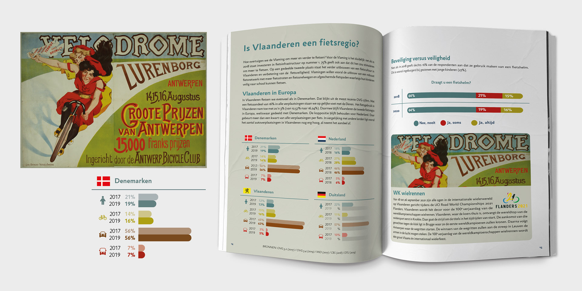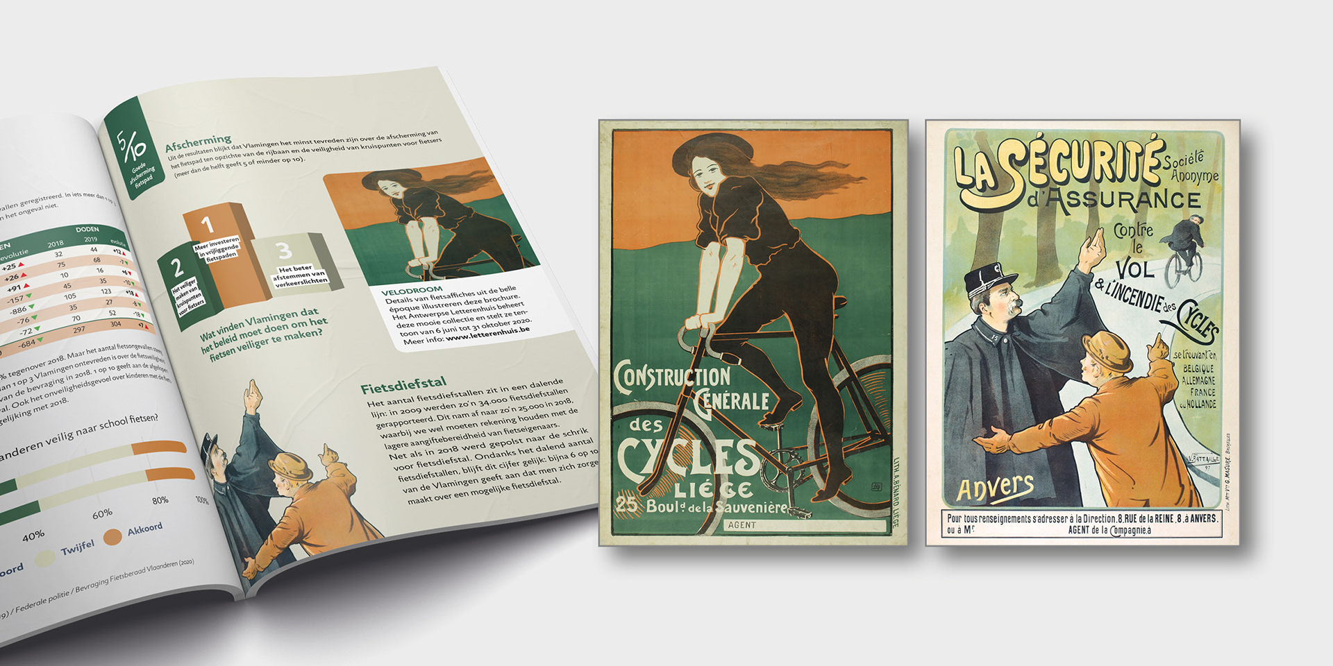 Een verzameling belle époque fietsaffiches uit de expo Velodroom, die tijdens de zomer van 2020 werd tentoongesteld in het Letterhuis in Antwerpen dienden als inspiratie en illustraties in de brochure. Deze affiches tonen meteen ook aan dat fietsen al heel lang deel uitmaakt van het DNA van de Vlaming.